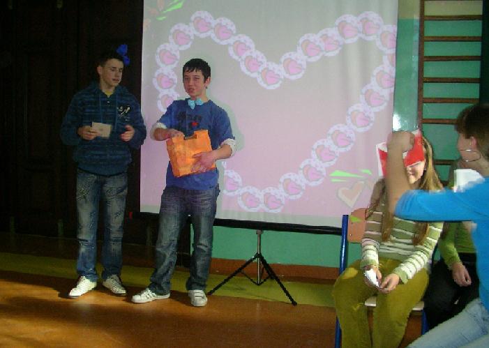 Impreza rozpoczęła się przedstawieniem przygotowanym przez uczniów klasy Ib, IIb i IIIa pod kierunkiem pani Sławomiry Głodek. Na początku przypomniane zostały zwyczaje związane z Dniem Zakochanych, a następnie przedstawiono historię jego istnienia. W dalszej części zaprezentowano wiersze i rozmowy liryczne. Całość przeplatana była piosenkami: Marka Grechuty, Katarzyny Sobczak, Alicji Majewskiej, Seweryna Krajewskiego oraz zespołów: „Mannam”, „Trubadurzy”, ”Czerwone Gitary”, „TILT”.