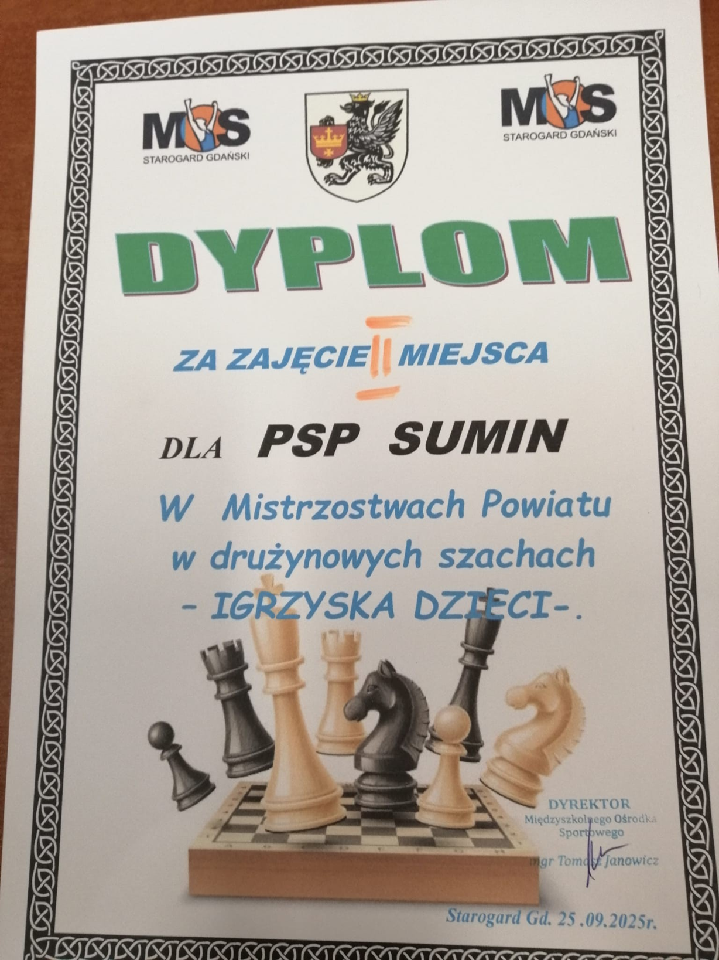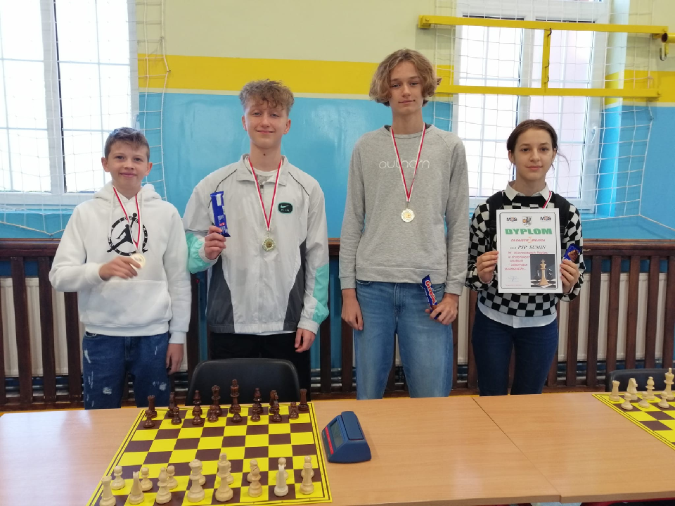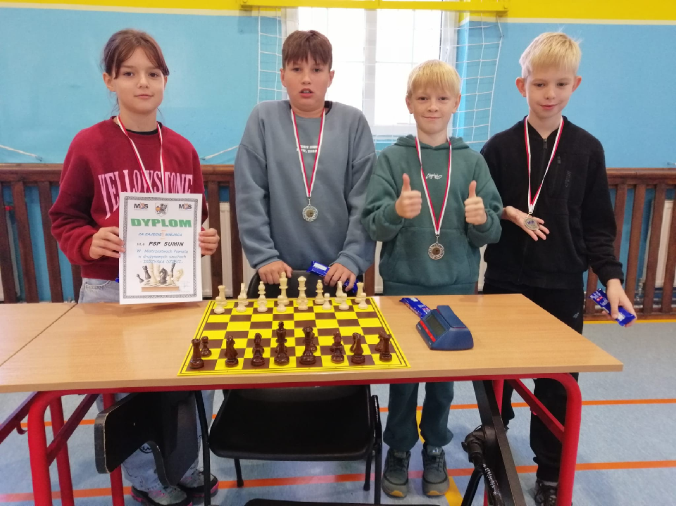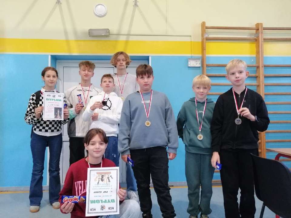 Mamy mistrzów i wicemistrzów powiatu w szachach drużynowych. Gratulacje! Grupa starsza w składzie: Agata, Jasiu, Tymek i Florian będą reprezentować naszą szkołę i powiat starogardzki na Półfinałach Wojewódzkich. Skład grupy młodszej : Marta, Tymon, Oliwier i Franek.