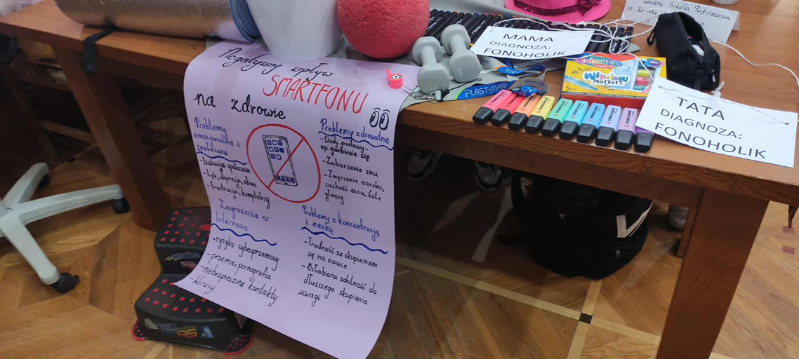 W dniu 26 września 2025r. odbył się w Bolesławowie Sejmik Ekologiczny pod hasłem ‘’Sport bez smartfona’’. Naszą szkołę reprezentowały uczennice Lena Aleksandrowicz, Oliwia Czuba i Aleksandra Kapałka. Uczennice przedstawiły bardzo interesującą prezentację pt. ”Negatywny wpływ smartfonów na zdrowie młodzieży”. Przedstawiły skutki zdrowotne, wpływ na relacje społeczne, edukację i rozwój, oraz konsekwencje społeczne. Dziewczyny zagrały autorską scenkę –fragment lekcji wychowania fizycznego, zachęciły uczestników sejmiku do ruchu . Oliwia wcieliła się w rolę dziecka zaniedbanego przez uzależnionych od telefonu rodziców. Lena świetnia zagrała ojca, a Ola matkę fonoholiczkę. Uczennice zaprezentowały plakat ze skutkami nadużywania telefonu w życiu codziennym. Całość występu była na bardzo wysokim poziomie, mnóstwo strojów i gadżetów uatrakcyjniło nasz występ. Jesteśmy bardzo dumni z naszych uczennic.