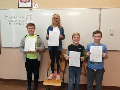W piątek 4 października obchodzono Światowy Dzień Tabliczki Mnożenia. W naszej szkole uczczono ten dzień klasowymi konkursami. Uczniowie klasy piątej oraz część uczniów klas szóstych walczyła o tytuł "Mistrza Tabliczki Mnożenia". Przykładów było dużo, a czasu niewiele. Walka była zacięta, a o miejscach na podium przesądziły pojedyncze punkty. Gratulujemy zwycięzcom konkursu, a wszystkim życzymy zdobycia tytułu "Mistrza Tabliczki Mnożenia" w przyszłym roku :)
