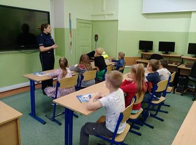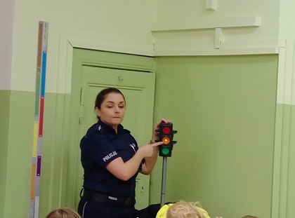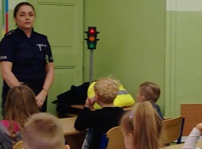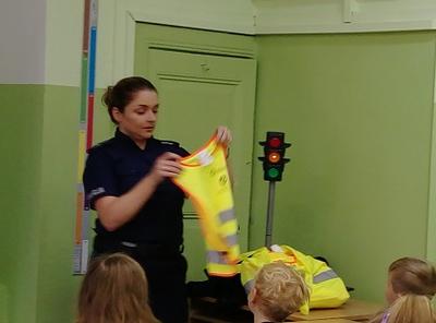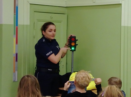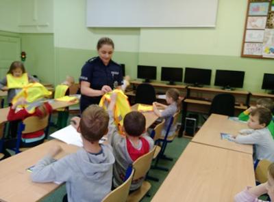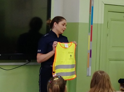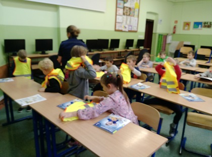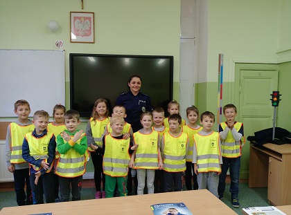 W dniu 25.10. 2019 uczniowie klasy pierwszej uczestniczyli w spotkaniu z funkcjonariuszką KPP w Starogardzie Gdańskim. Pani policjantka omówiła z dziećmi zasady bezpiecznego poruszania się po drogach w różnych sytuacjach i warunkach. Dzieci przypomniały sobie zasady przechodzenia przez jezdnię oraz zachowania się w sytuacji wypadku drogowego lub innego zdarzenia z udziałem służb ratunkowych. Powtórzyliśmy sobie ważne numery alarmowe. Na zakończenie spotkania dzieci otrzymały prezent w postaci kamizelki odblaskowej. Klasa pierwsza już wie, dlaczego bycie widocznym na drodze ma tak ogromne znaczenie, zwłaszcza w okresie jesienno- zimowym.