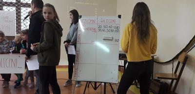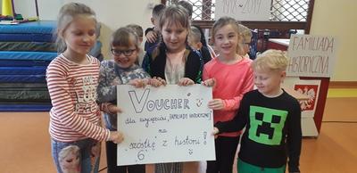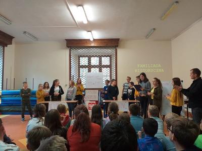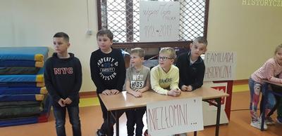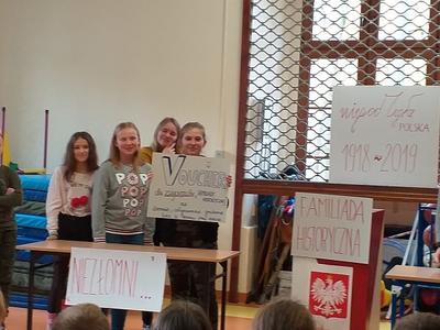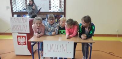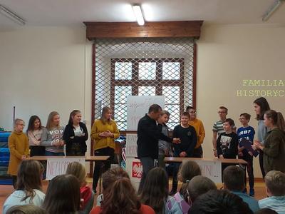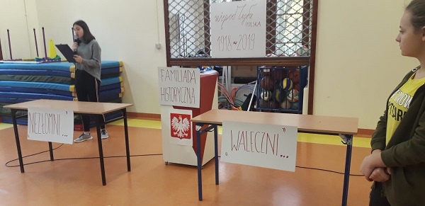 Z okazji 101. rocznicy odzyskania niepodległości przez Polskę, uczniowie naszej szkoły mieli okazję stanąć w niecodziennych szrankach historii. Nasi najmłodsi (klasy I-III) oraz starsi uczniowie (klasy V-VIII), rywalizowali w konkursie pt. FAMILIADA HISTORYCZNA zorganizowanym na zasadach znanego kultowego teleturnieju Familiada. Pomysłodawcą i organizatorem programu był pan Grzegorz Pstrong. W liczeniu zdobywanych punktów przez drużyny rywalizujące ze sobą pomagały uczennice klasy VIII - Sandra, Nina i Nikola. Uczestnikami programu byli uczniowie naszej szkoły, należący do drużyn: NIEZŁOMNI i WALECZNI.