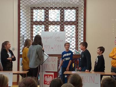 Pytania w turnieju dotyczyły wiedzy o naszym kraju ojczystym i były związane z historią odzyskania niepodległości przez Polskę np. Co kryje się pod słowem niepodległość? Rywalizacja składała się z dwóch rund pytań i rundy finałowej, a nagrodą główną w konkursie był voucher na szóstkę z historii. Rywalizacja była zacięta. W ostateczności wśród klas I-III zwycięstwo należało do drużyny WALECZNYCH a w rywalizacji uczniów starszych zwyciężyli NIEZŁOMNI.