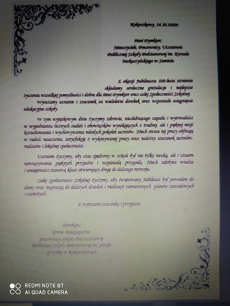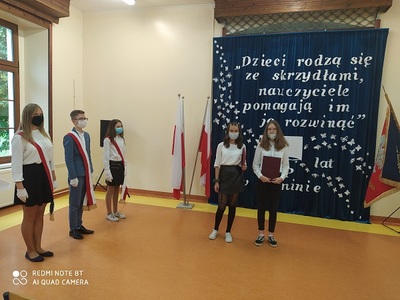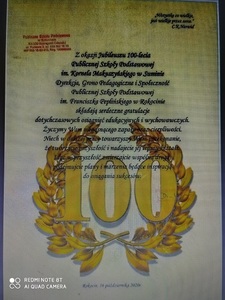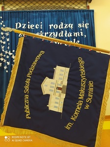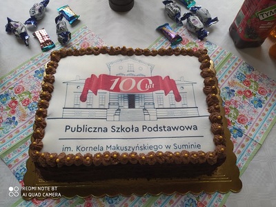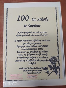 16 października 2020 roku nasza szkoła otrzymała piękny sztandar z rąk Pani Wójt Magdaleny Forc- Cherek ufundowany przez Urząd Gminy Starogard Gdański. Tym wielkim wydarzeniem szkoła rozpoczęła obchody jubileuszu 100-lecia swojego istnienia. Poświęcenia sztandaru dokonał proboszcz tutejszej parafii ks. Damian Plackowski. Swoją obecnością zaszczycili nas również radni- panowie Jan Gmer (fundator i wykonawca gabloty do sztandaru) oraz Michał Piaskowski, jak również przedstawicielki Rady Rodziców- panie Karolina Kapałka i Karolina Stormowska. Ze względu na zaistniałe warunki epidemiologiczne nie mogli przybyć na uroczystość zaproszeni dyrektorzy szkół z rejonu naszej gminy. Jednak swoją obecność z nami zaznaczyli przesyłając na ręce pani dyrektor Barbary Rozwadowskiej wspaniałe życzenia, które mogliśmy wspólnie odczytać i obejrzeć podczas święta szkoły. Cała uroczystość przebiegała z zachowaniem zasad reżimu sanitarnego. W związku z tym społeczność szkolna uczestniczyła w uroczystości online. Uczniowie za pośrednictwem aplikacji Teams śledzili przebieg wydarzeń i włączyli się do wspólnego odśpiewania hymnu w trakcie trwania uroczystości. Po uroczystym przekazaniu sztandaru i złożeniu ślubowania przez poczet sztandarowy, uczniowie zaprezentowali program artystyczny nawiązujący tematyką do Dnia Edukacji Narodowej. Po oficjalnych uroczystościach zaproszeni goście udali się na słodki poczęstunek przygotowany przez Radę Rodziców. Uroczystego krojenia tortu przygotowanego specjalnie na tę okazję przez panią Emilię Gmer dokonała osobiście Pani Wójt. Goście przybyli na uroczystość zostali obdarowani upominkami wykonanymi przez uczniów klasy VIIIa- dekoracyjnymi mydełkami powstałymi na warsztatach mydlarskich. Każdy upominek ozdobiony został pieczęcią jubileuszową przygotowaną specjalnie na obchody 100-lecia istnienia szkoły. W tym momencie należy skierować szczególne słowa podziękowania do nauczycieli- pani Emilii Ciesielskiej, pani Wiktorii Zuchniak, pana Grzegorza Pstronga, którzy całym sercem zaangażowali się w realizację projektu sztandaru, banerów jubileuszowych, przygotowanie pięknej oprawy uroczystości i czuwanie nad jej przebiegiem. Dziękujemy wszystkim, którzy włączyli się w jakikolwiek sposób do tego, że uroczystość miała tak piękny i niepowtarzalny charakter.