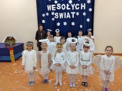 Aniołki z Oddziału Przedszkolnego z okazji Świąt Bożego Narodzenia przygotowały krótki program artystyczny chcąc w ten sposób życzyć wszystkim zdrowych, radosnych i spokojnych świąt.