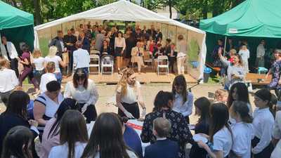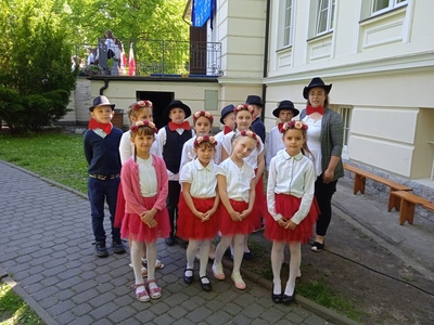 "Każdy ma swe urodziny- Jasio, Basia, Staś i Krysia. Ma je także Nasza Szkoła, więc je obchodzimy dzisiaj. Choć skończyła już wiek cały, to się całkiem nieźle trzyma. Jak dostojna wielka Dama, Wiosna , Lato, Jesień, Zima. Życzymy Szkole na urodziny ścian kolorowych i ławek nowych. Uczniów radosnych zimą i wiosną, życzymy Szkole dziś..."