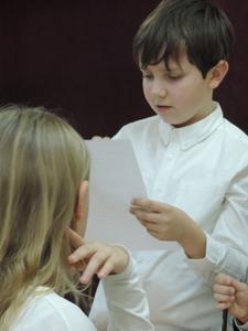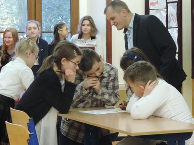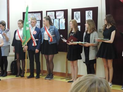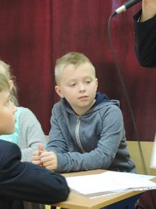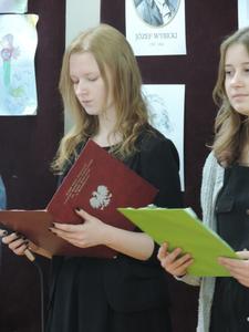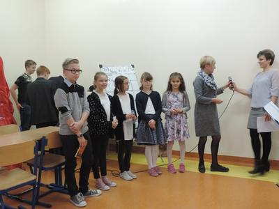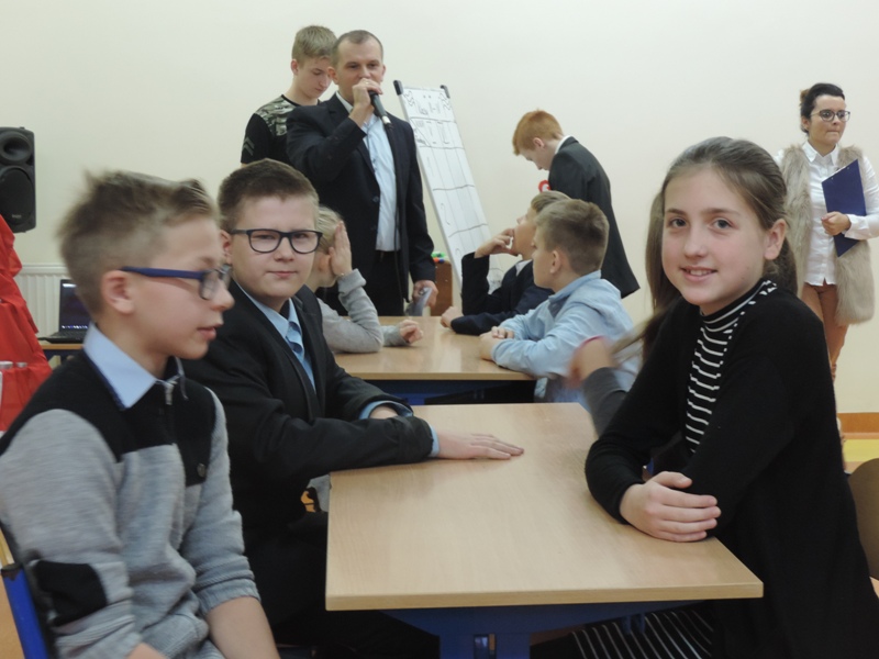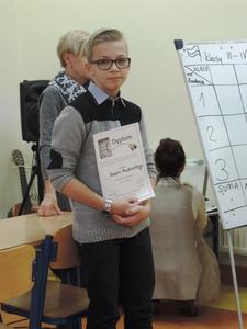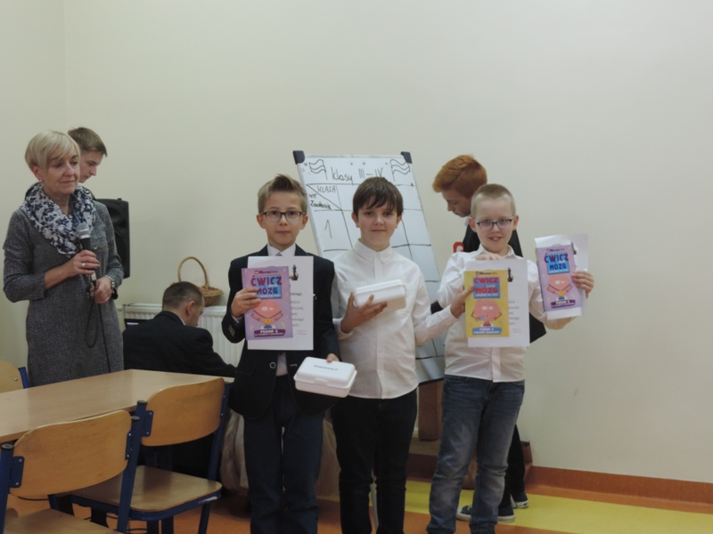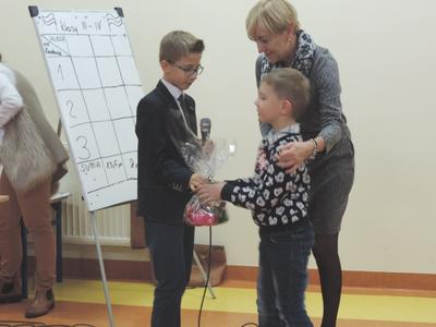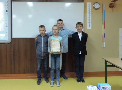 Po historycznych zmaganiach pani Dyrektor wręczyła nagrody za udział w gminnych i szkolnych konkursach. Również przedstawiciel samorządu uczniowskiego Wojtek Ciemiński wręczył upominek oddziałowi przedszkolnemu za najpiękniejsze wykonanie obrazu jesiennego drzewa.