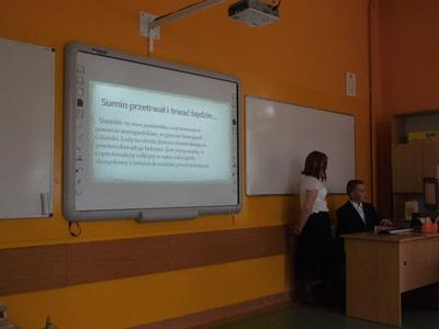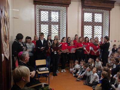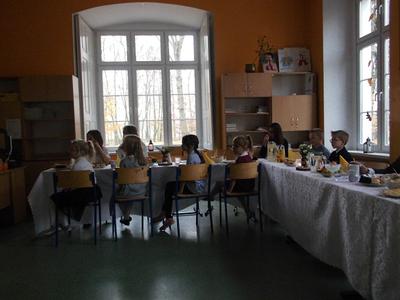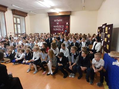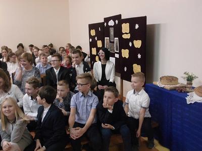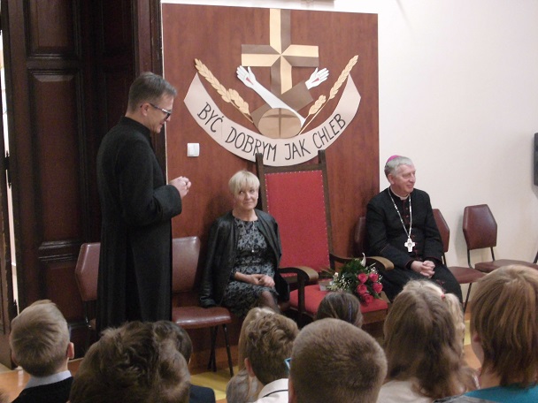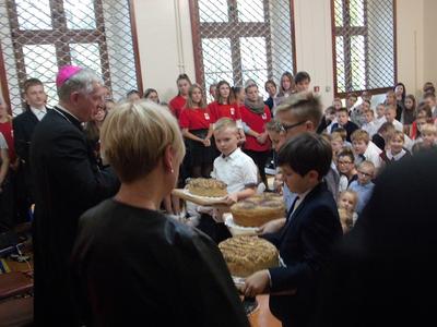Kolejnym punktem programu był montaż słowno – muzyczny „Dzielmy się wiarą jak chlebem” (przygotowany pod kierunkiem pani Krystyny Kowalskiej), nawiązujący do postaci św. Brata Alberta. Po obejrzeniu części artystycznej, ks. biskup pobłogosławił chleb oraz uczestników uroczystości i udał się na spotkanie z gronem pedagogicznym, pracownikami PSP w Suminie oraz przedstawicielami Rady Rodziców i Samorządu Uczniowskiego. Gospodarze poszczególnych klas podzielili się chlebem ze swoimi kolegami i koleżankami.
