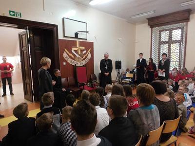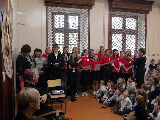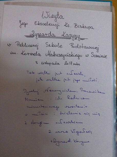 8 listopada 2017 r. naszą szkołę odwiedził Biskup Pelpliński Ryszard Kasyna. Jego Ekscelencję powitał radosnym śpiewem szkolny zespół wokalny, Pani Dyrektor oraz uczniowie. Swoje słowo powitalne wygłosił również ks. Damian – proboszcz sumińskiej parafii. Następnie głos zabrał ks. biskup, odpowiadał też na pytania zadawane przez uczniów.