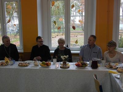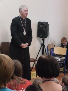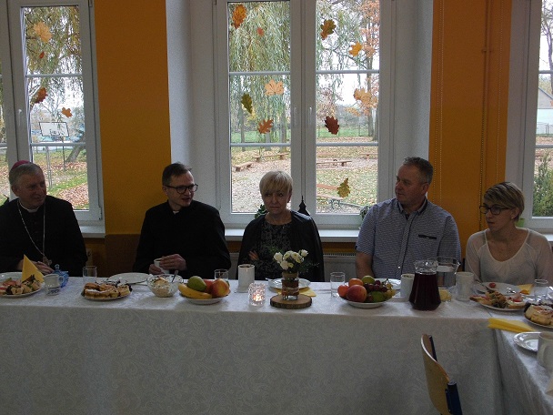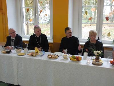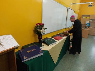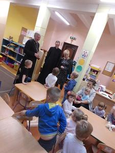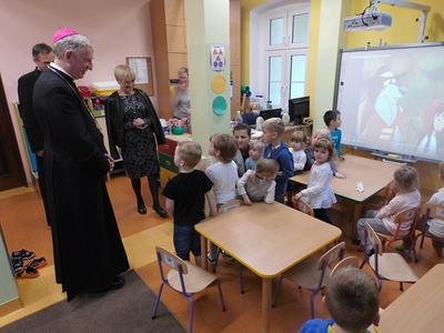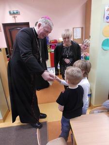 Spotkanie z ks. biskupem zakończyło się uroczystym wpisem do księgi pamiątkowej i wizytą u dzieci z Punktu Przedszkolnego. Ksiądz Biskup obdarował maluszki pamiątkowymi obrazkami, a nasi milusińscy odwdzięczyli się ciepłym i miłym przyjęciem.