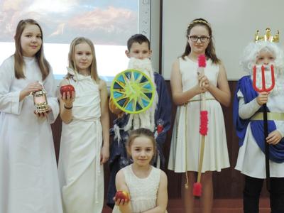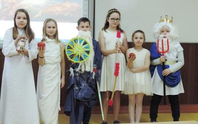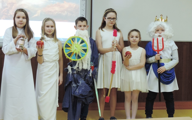 Trzynastego lutego na lekcji języka polskiego do naszej klasy zawitali bogowie greccy. Byli to Zeus, Posejdon, Afrodyta, Artemida i Hestia. Przedstawiciele Olimpu mieli bogate stroje oraz piękne rekwizyty. Opowiadali bardzo ciekawe rzeczy o sobie i życiu wśród innych bogów. Później nasi goście odwiedzili również klasę trzecią, gdzie spotkali się z bardzo miłym przyjęciem. Bardzo podobała się nam ta lekcja.